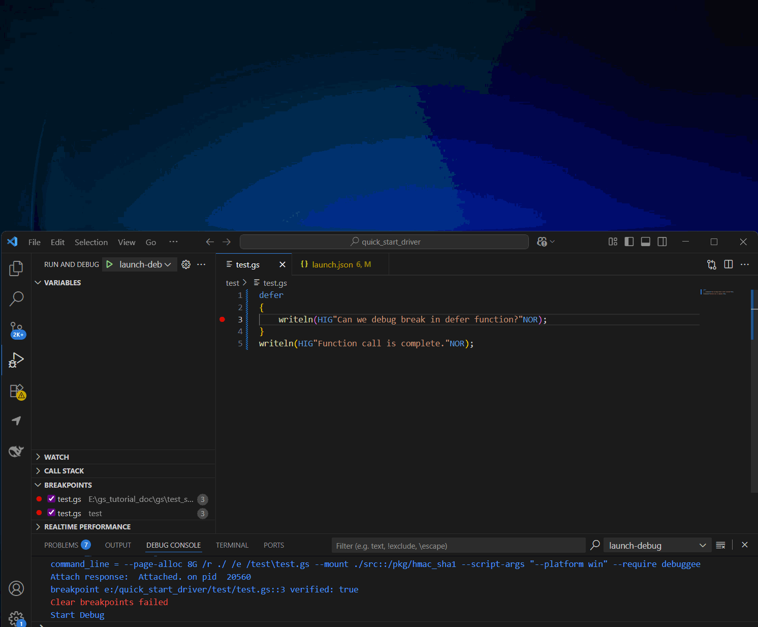 从示例可以看到添加断点,按下F5执行程序后,gslang成功在外部函数执行完成后命中了defer函数中的断点。命中断点后按下F10单步执行一条语句,defer 语句中的输出被成功输出在了控制台上。